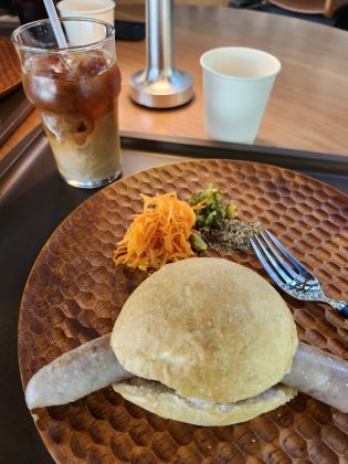 工場の敷地内にあるおしゃれな施設のカフェで、食べ方に迷う美味しいソーセージのバーガーを食べてきました♪